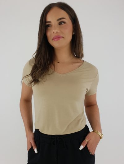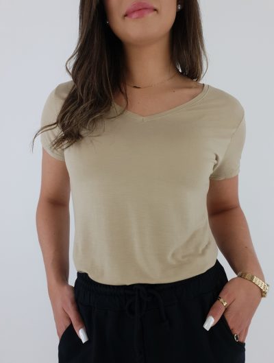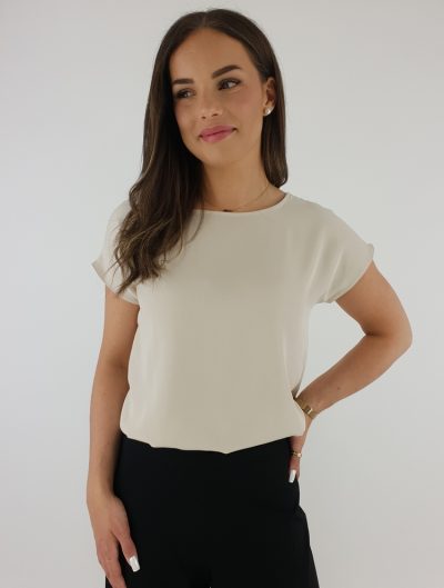 Elegancka Bluzka z Krótkim Rękawem i Ściągaczem – Beżowa
