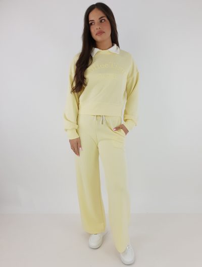 Komplet dresowy masełko to stylowy komplet dresowy damski z krótką bluzą z kołnierzykiem i szerokimi spodniami. Model wykonany z elastycznej dzianiny (48% poliester, 46% wiskoza, 6% elastan), produkcja włoska. Rozmiar uniwersalny 36–42. Modelka ma 169 cm wzrostu i prezentuje rozmiar uniwersalny. Idealny komplet dresowy masełko na co dzień i na wyjazd.