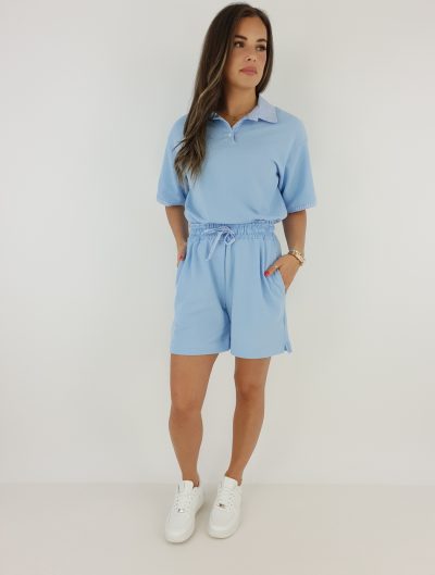 Komplet dresowy masełko to stylowy komplet dresowy damski z krótką bluzą z kołnierzykiem i szerokimi spodniami. Model wykonany z elastycznej dzianiny (48% poliester, 46% wiskoza, 6% elastan), produkcja włoska. Rozmiar uniwersalny 36–42. Modelka ma 169 cm wzrostu i prezentuje rozmiar uniwersalny. Idealny komplet dresowy masełko na co dzień i na wyjazd.