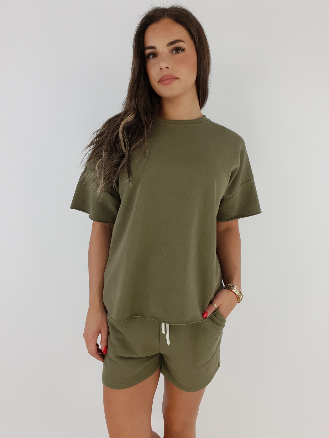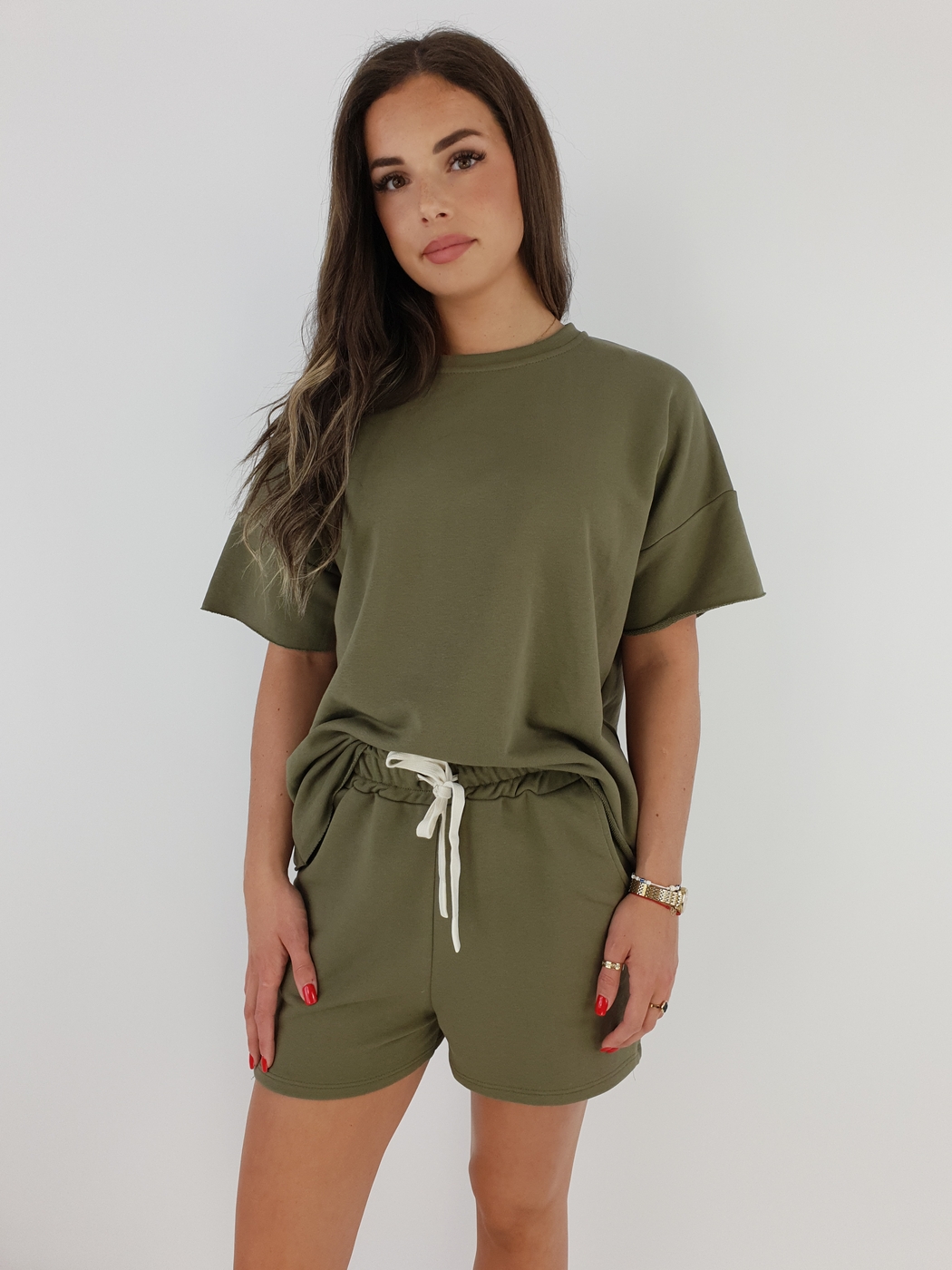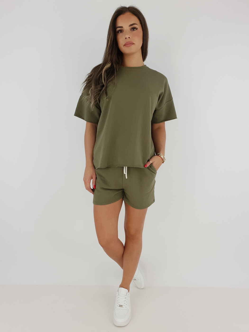 Bawełniany Khaki Komplet Dresowy z Krótkim Rękawem i Szortami