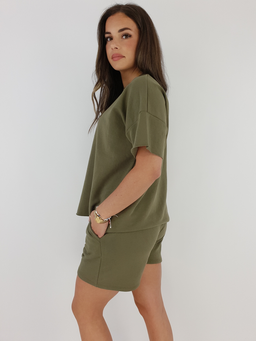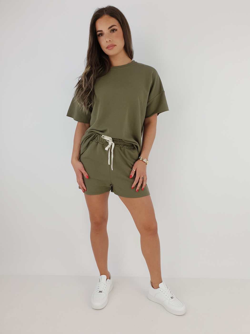 Zestaw składa się z luźnej bluzki z krótkim rękawem oraz spodenek z wysokim stanem. Góra ma klasyczny, okrągły dekolt, co sprawia, że pasuje do każdego typu sylwetki. Szorty posiadają elastyczną talię ze ściągaczem i sznurkiem, co pozwala na indywidualne dopasowanie. Dodatkowe kieszenie boczne zwiększają funkcjonalność kompletu, co czyni go praktycznym wyborem na każdy dzień.