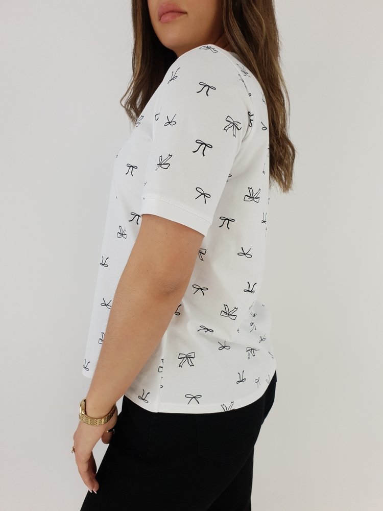 T-shirt damski w kokardki to idealny wybór na co dzień i nie tylko. Wykonany z bawełny z dodatkiem elastanu, zapewnia komfort i świetnie dopasowuje się do sylwetki. Delikatny wzór kokardek dodaje uroku, a włoska jakość wykonania gwarantuje trwałość. Model pasuje na rozmiary od 36 do 40 – must-have każdej kobiecej szafy!