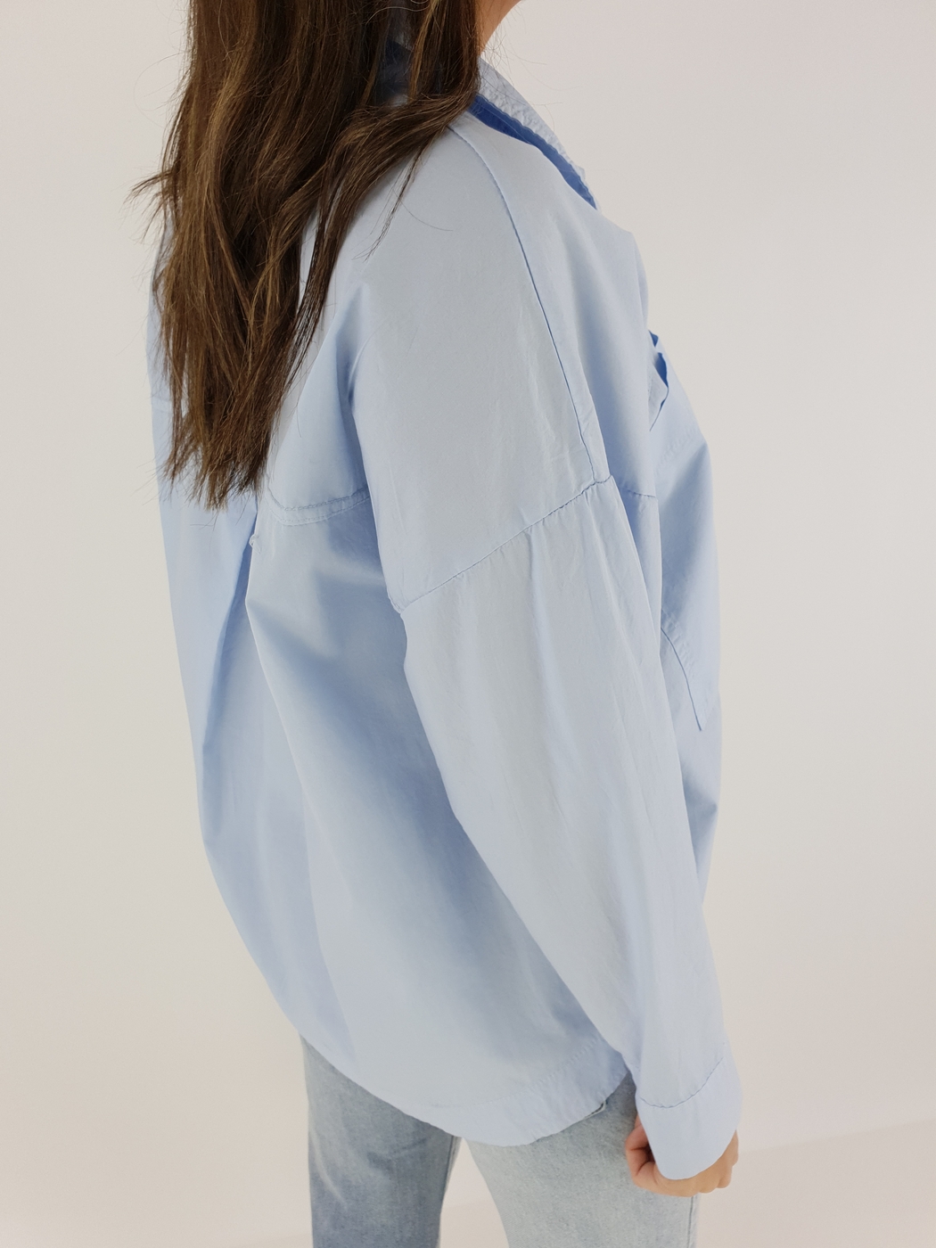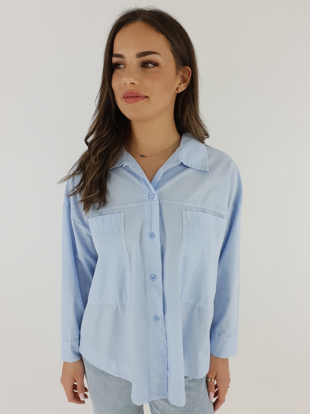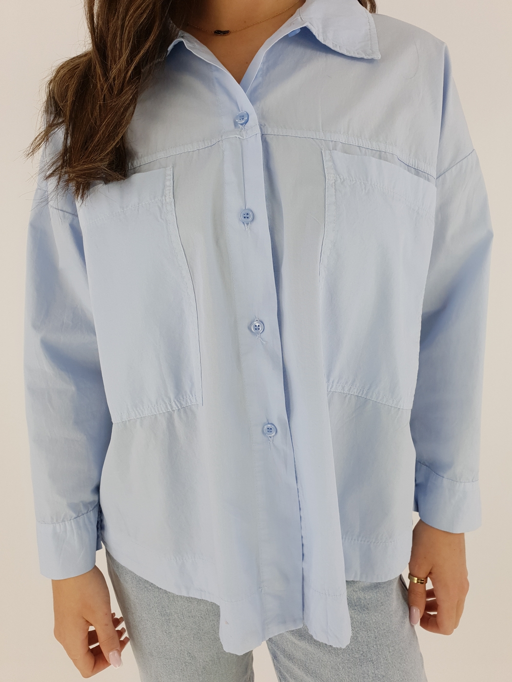 Błękitna Koszula Oversize z Lekkiej Bawełny z Kieszeniami