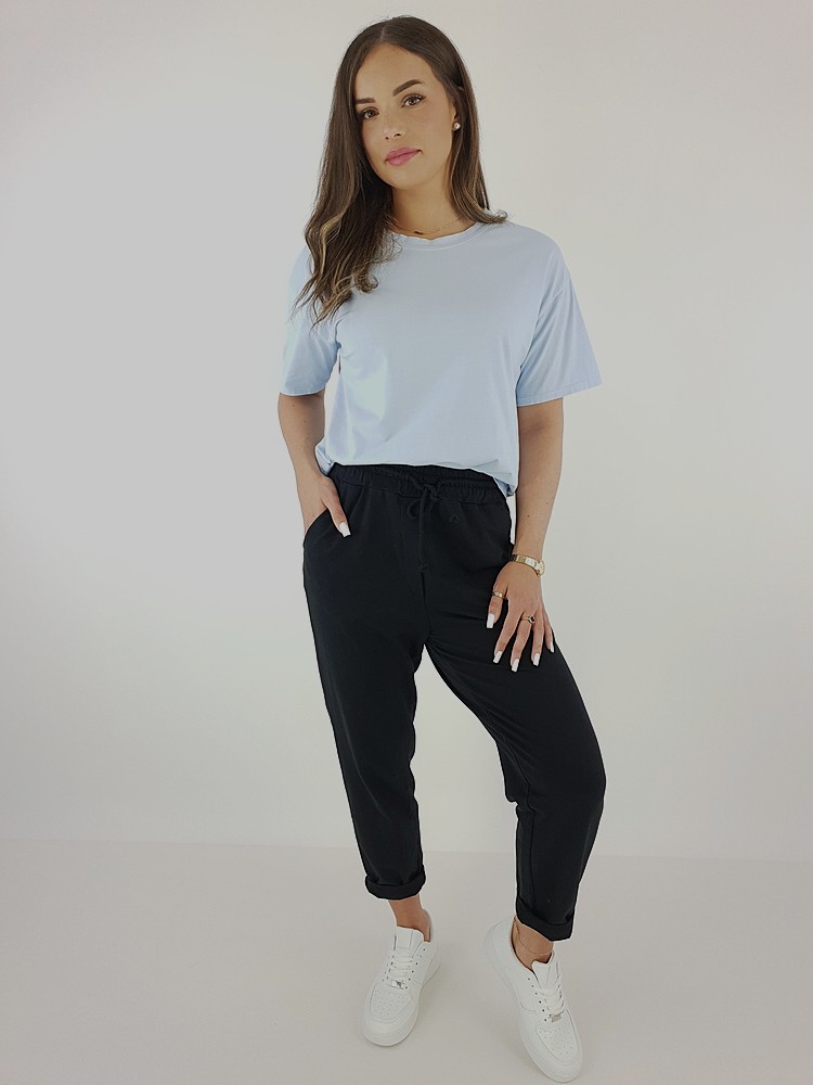 Komfortowy T-shirt typu oversize, wyprodukowany we Włoszech, z przewiewnej bawełny z dodatkiem elastanu. Idealnie dopasowuje się do sylwetki. Rozmiar uniwersalny (36–42). Modelka o wzroście 169 cm ma na sobie rozmiar uniwersalny.