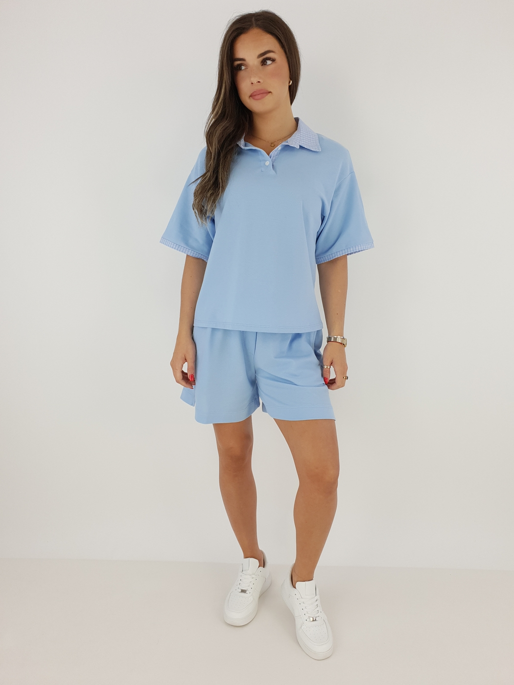 Kołnierzyk z delikatnym wzorem kratki i krótki rękaw nadają górze sportowo-eleganckiego charakteru. Spodenki z luźnymi nogawkami oraz elastycznym pasem zapewniają pełną swobodę ruchów i komfort noszenia. Dzięki niebieskiemu odcieniowi komplet prezentuje się świeżo i dziewczęco. Całość tworzy spójną, nowoczesną stylizację, która pasuje do wielu okazji.