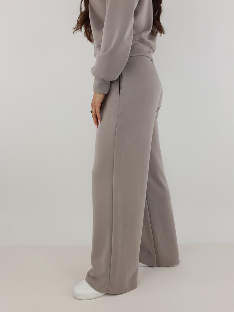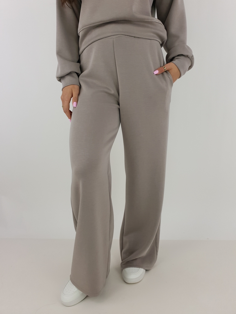 Spodnie wchodzące w skład kompletu posiadają wygodny pas oraz praktyczne kieszenie. Szeroka nogawka nadaje stylizacji lekkości, a jednocześnie wpisuje się w aktualne trendy. Dzięki temu komplet dresowy masełko możesz nosić zarówno z trampkami, jak i z eleganckimi sneakersami.