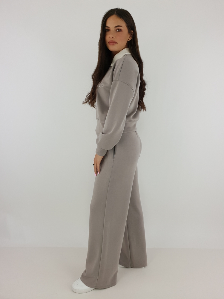 Górna część zestawu to krótka bluza z kołnierzykiem, która przyciąga uwagę subtelnym haftem. Minimalistyczny detal dodaje całości klasy, natomiast obniżona linia ramion wprowadza modny, luźny akcent. Ponadto delikatnie dopasowany dół sprawia, że bluza świetnie układa się na sylwetce.
