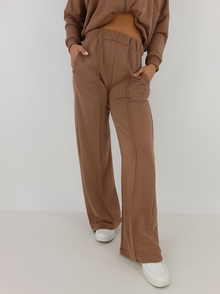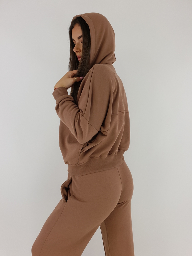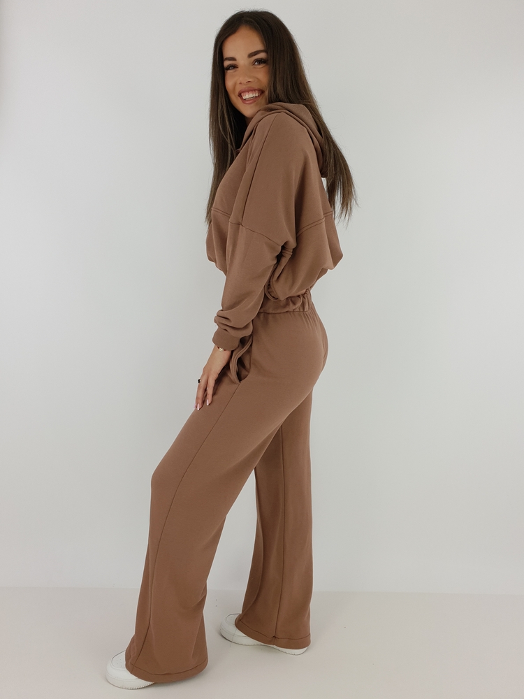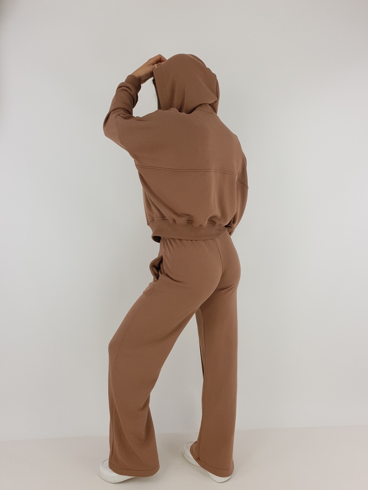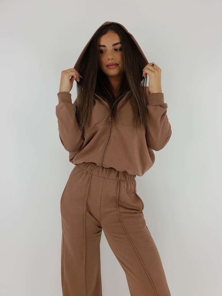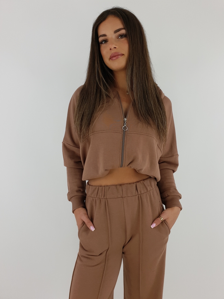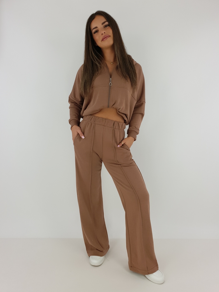 Komplet Dresowy Karmelowy Z Kapturem – Krótka Bluza I Spodnie Z Przeszyciem