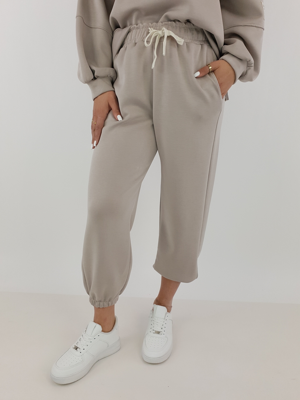 Spodnie w komplecie posiadają wygodny krój, który dobrze dopasowuje się do różnych typów sylwetek. Elastyczny pas zapewnia komfort noszenia przez cały dzień, a jednocześnie utrzymuje spodnie na odpowiedniej wysokości. Ponadto nogawki zakończone ściągaczem nadają całości lekko sportowego charakteru. Dzięki temu komplet dresowy masełko jest praktyczny i stylowy jednocześnie.