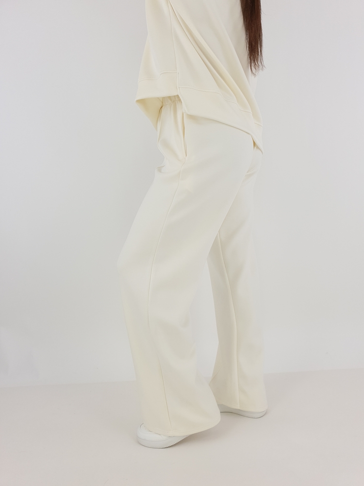 Spodnie wchodzące w skład zestawu wyróżniają się szeroką nogawką oraz modnym przeszyciem z przodu. Dzięki temu sylwetka prezentuje się smukło i proporcjonalnie. W pasie znajduje się wygodna gumka oraz troczek, dlatego spodnie dopasowują się do figury. Co więcej, praktyczne kieszenie zwiększają funkcjonalność całego kompletu. Taki krój sprawia, że komplet dresowy masełko wygląda modnie i jednocześnie pozostaje bardzo komfortowy.