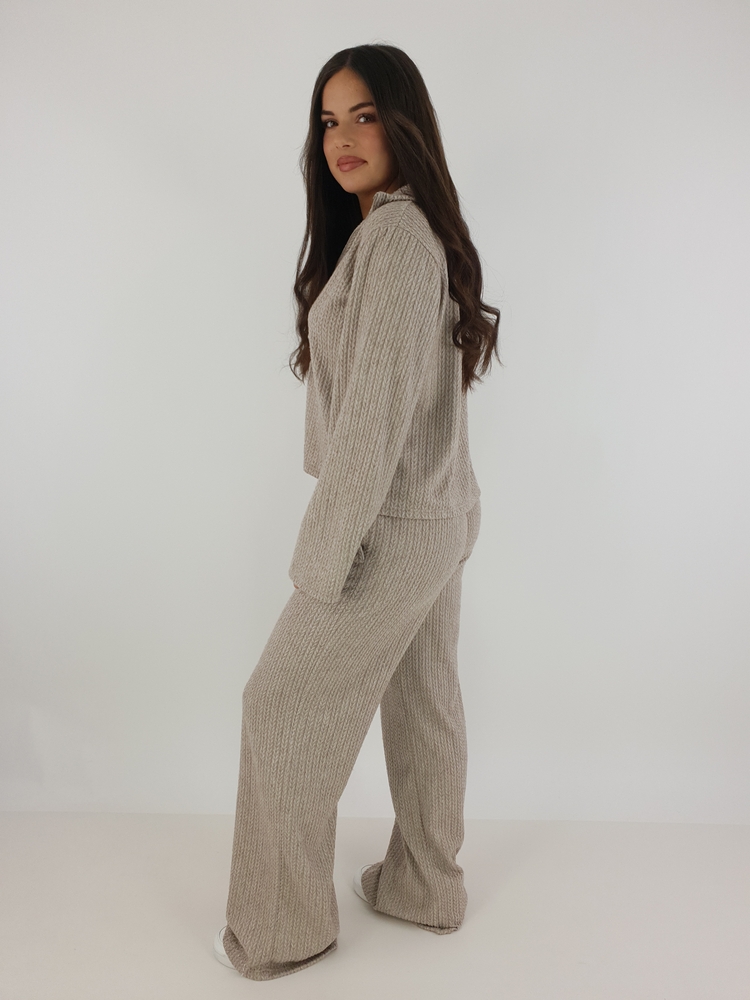 Model został wykonany z tkaniny o składzie 70% wiskoza oraz 30% poliester. Wiskoza odpowiada za miękkość oraz przewiewność materiału, dlatego komplet dzianinowy damski jest przyjemny dla skóry. Poliester zwiększa trwałość i odporność na zagniecenia, a więc komplet zachowuje estetyczny wygląd przez długi czas. Materiał jest elastyczny, dzięki czemu dopasowuje się do ruchów ciała. Jednocześnie struktura dzianiny nadaje całości subtelnego, eleganckiego charakteru.