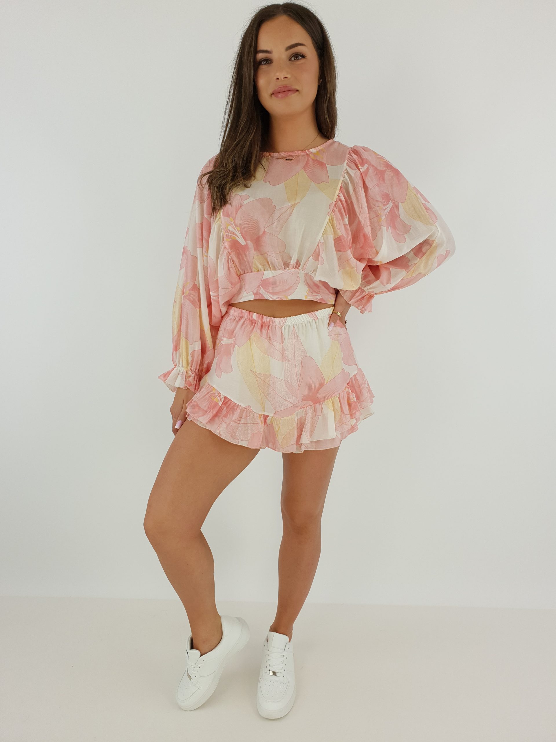 Romantyczny Komplet Kwiatowy z Falbankami – Top i Shorty