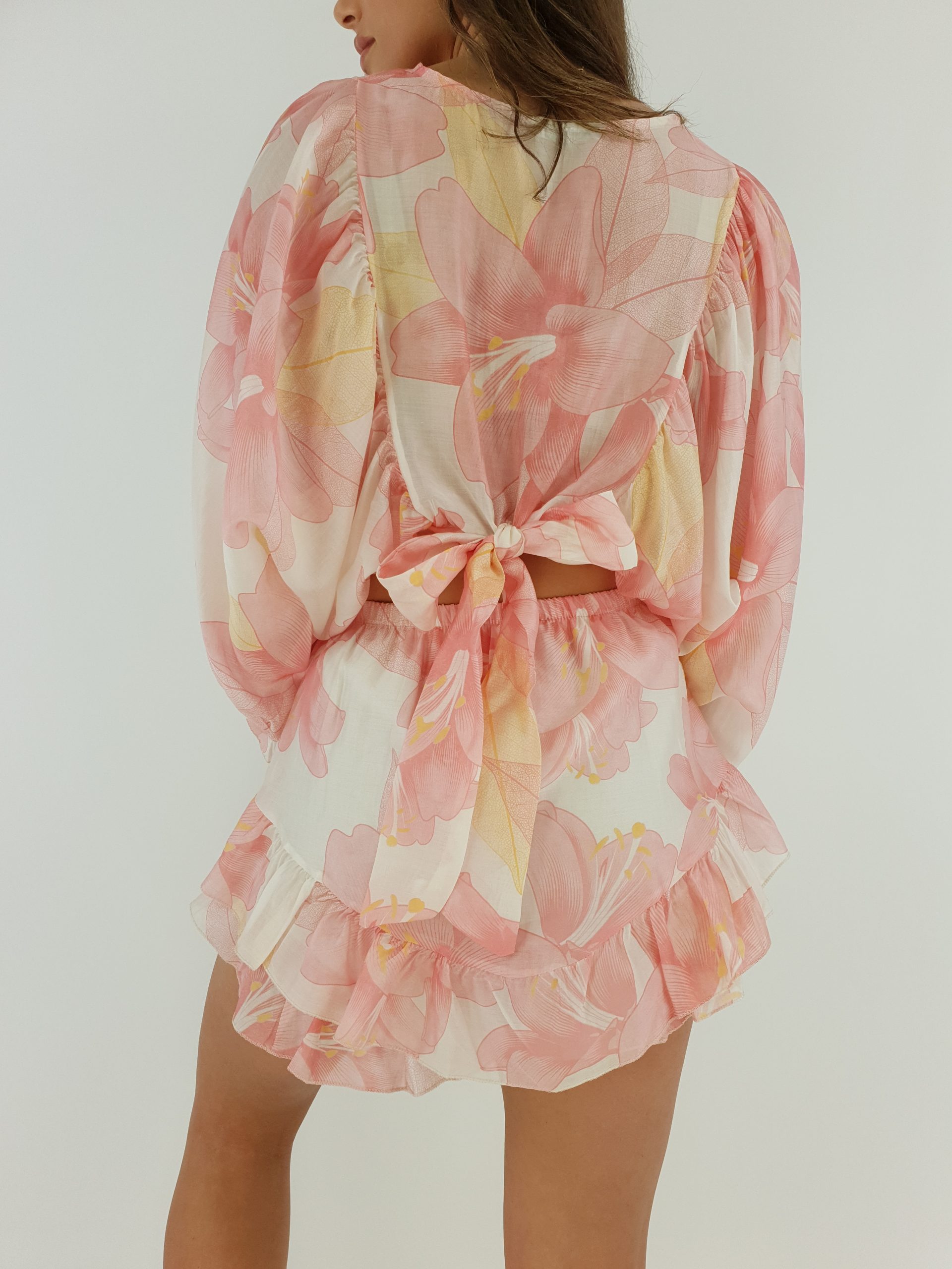 Falbanki na dole shortów dodają lekkości i romantycznego uroku. Top z delikatnie bufiastymi rękawami prezentuje się efektownie zarówno z przodu, jak i z tyłu – dzięki wiązaniu na plecach można idealnie dopasować go do sylwetki. Całość tworzy modny look, który zachwyci zarówno w casualowych, jak i bardziej stylowych stylizacjach.