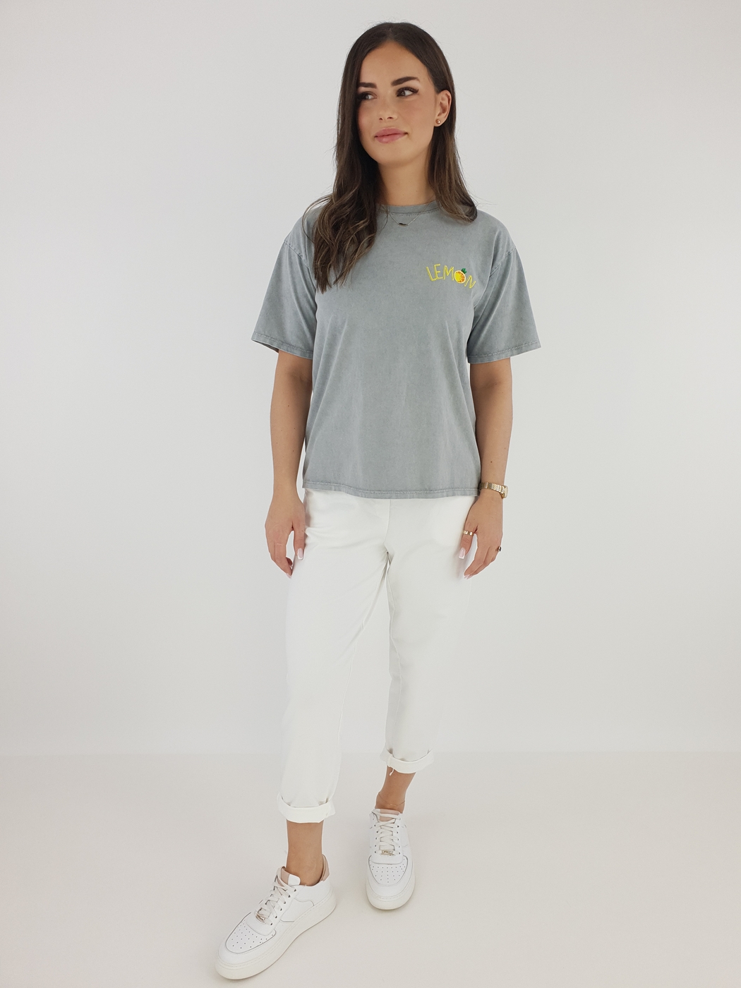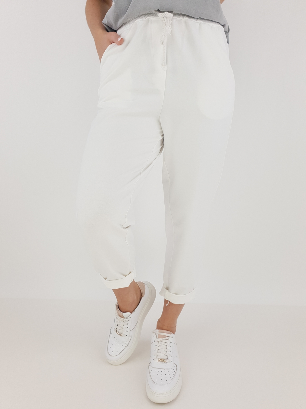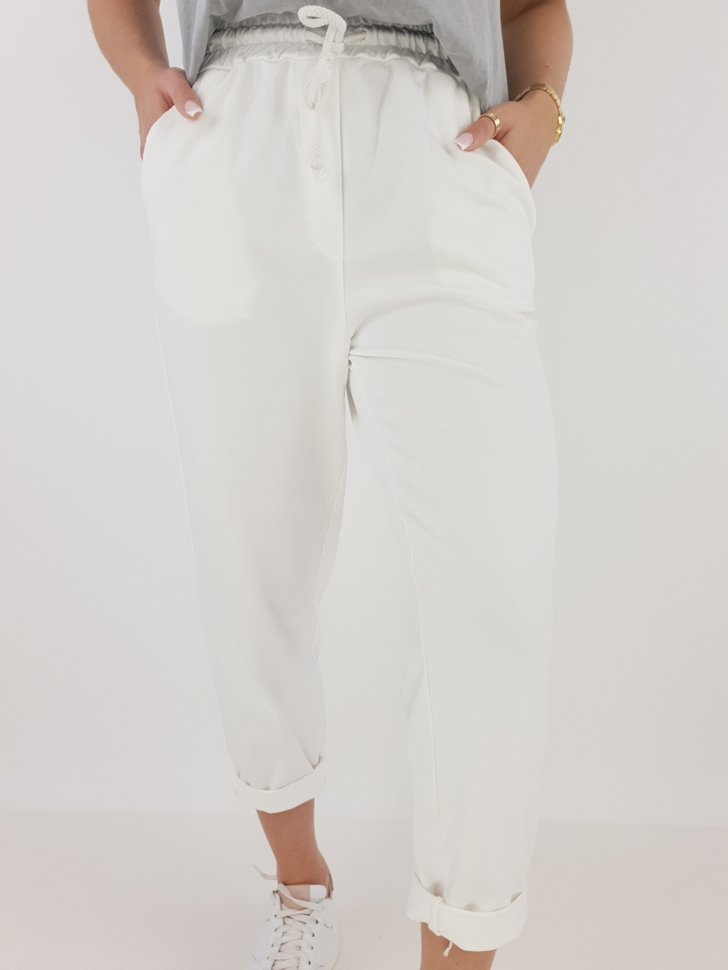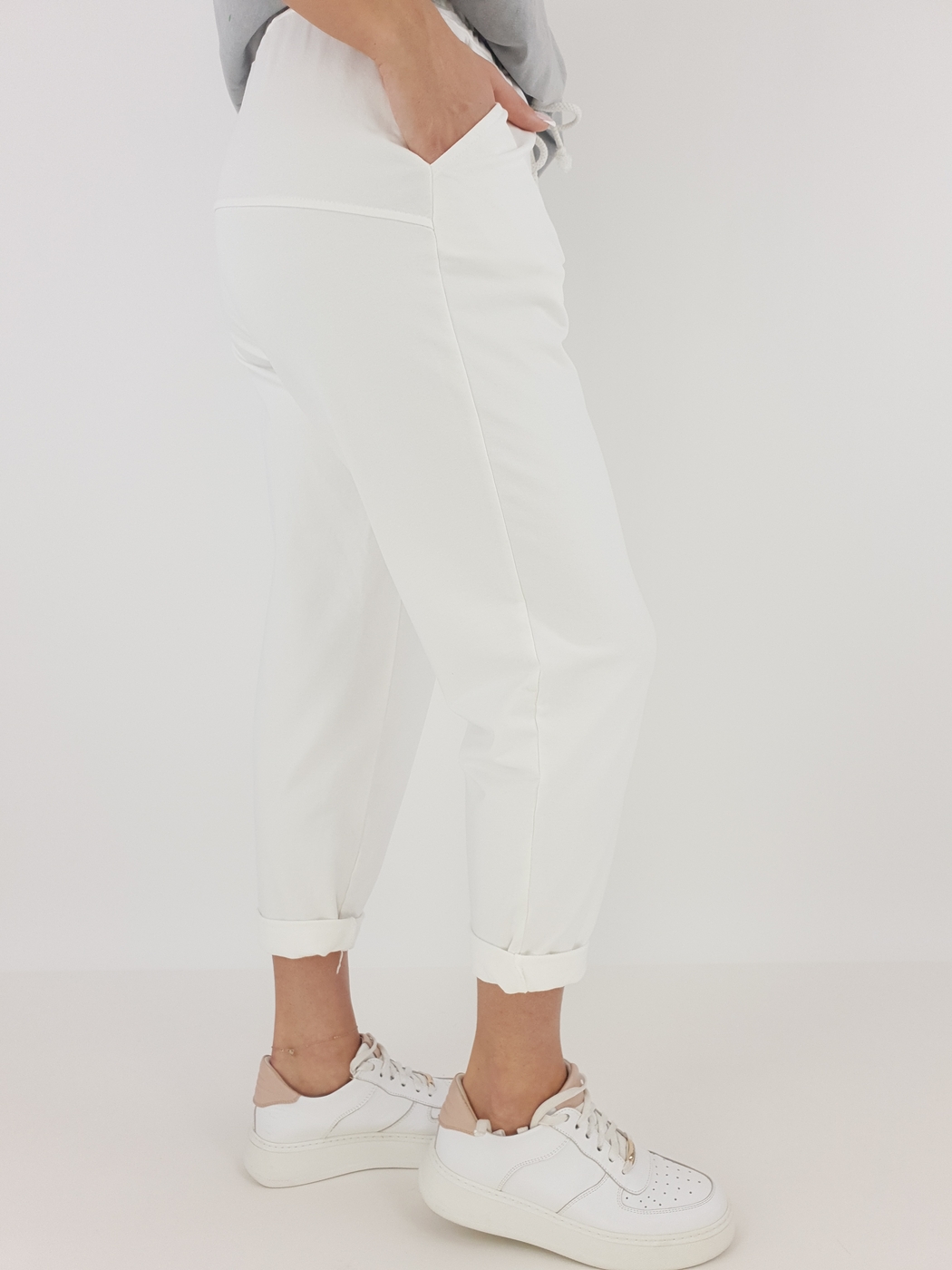 Dzięki uniwersalnemu rozmiarowi spodnie pasują na sylwetki w rozmiarze od 36 do 42. Elastyczny pas z regulacją gwarantuje komfort noszenia, a podwinięte nogawki dodają całości lekkości i nieformalnego stylu. Modelka o wzroście 169 cm prezentuje, jak dobrze spodnie układają się na różnych sylwetkach, co czyni je świetnym wyborem niezależnie od okazji.