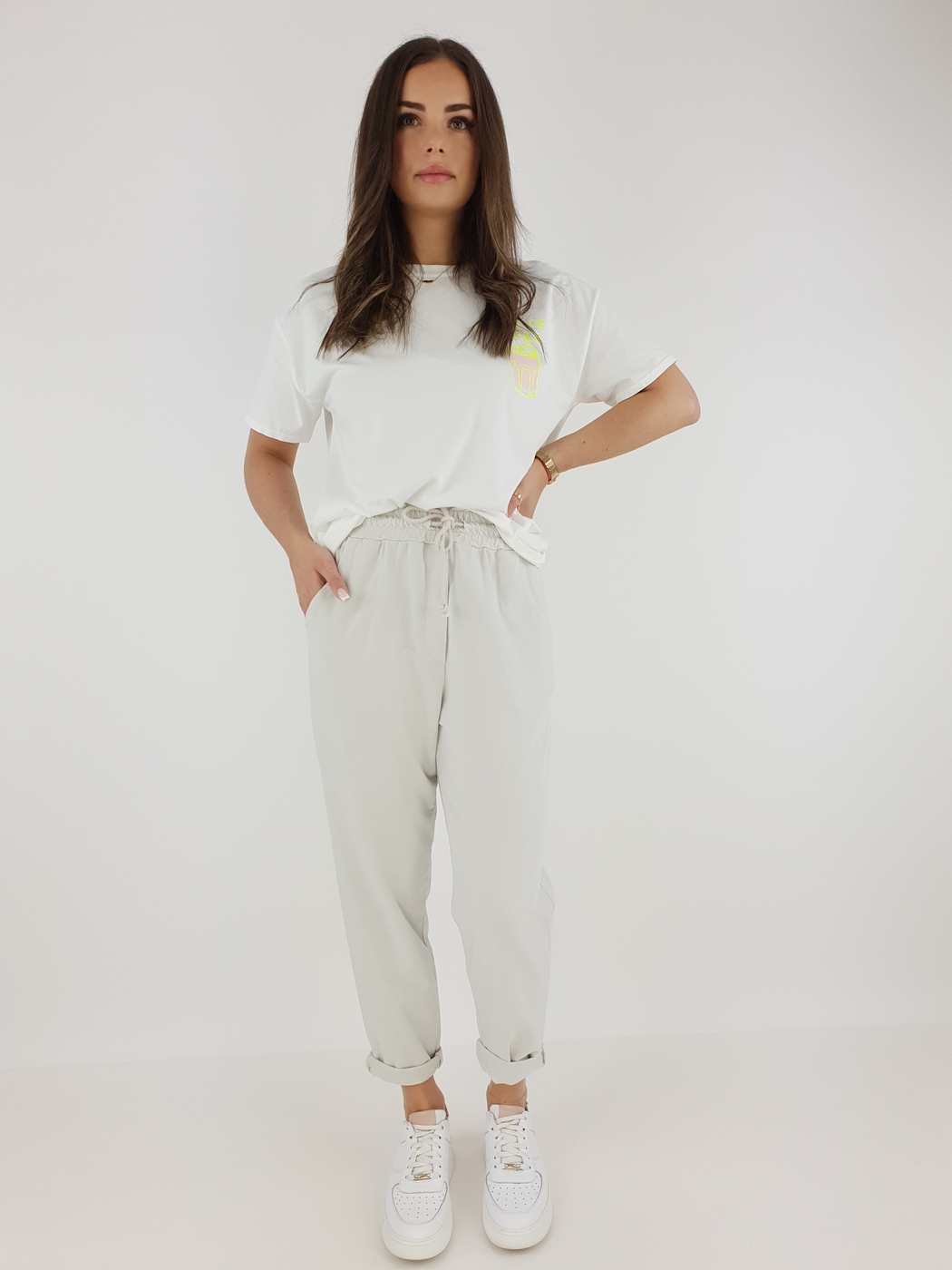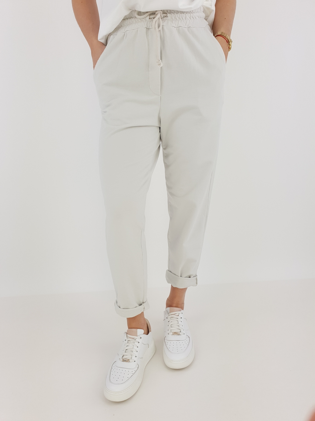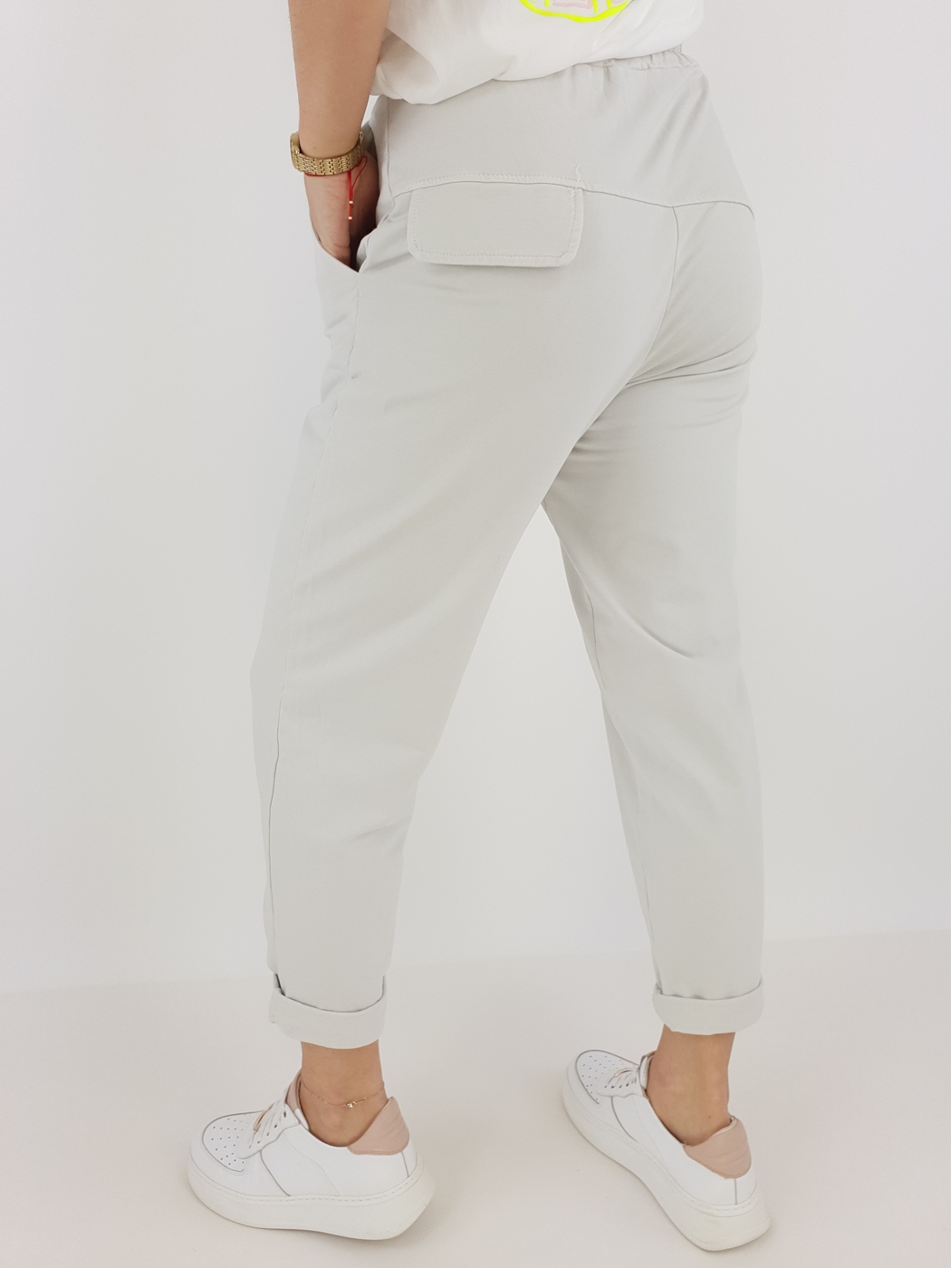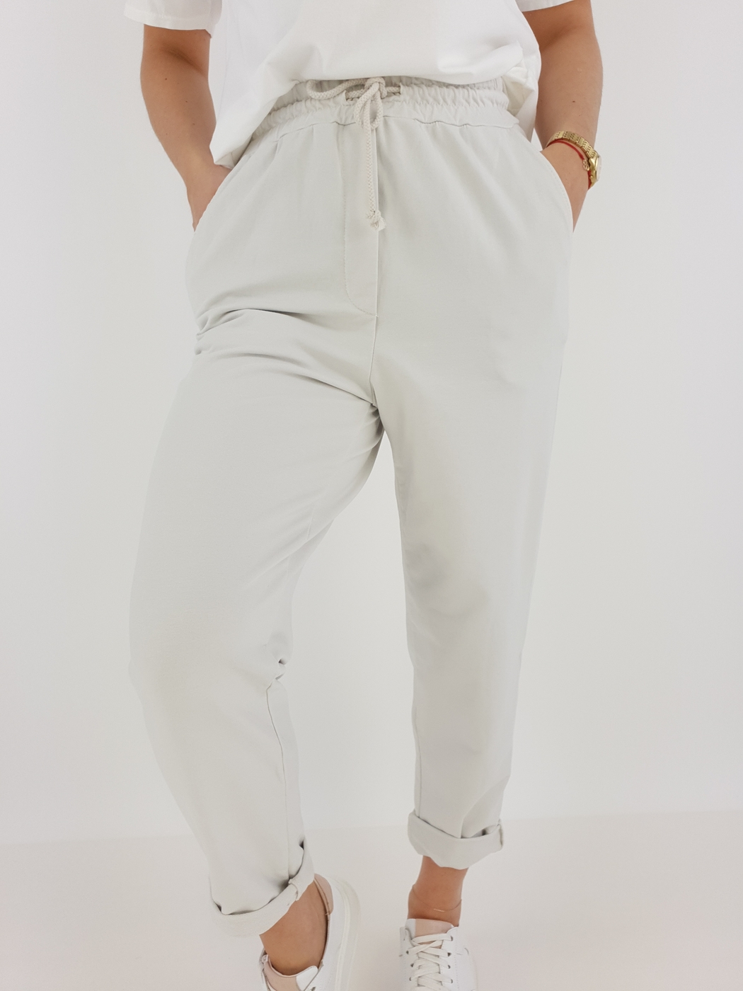 Dzięki uniwersalnemu rozmiarowi spodnie pasują na sylwetki w rozmiarze od 36 do 42. Elastyczny pas z regulacją gwarantuje komfort noszenia, a podwinięte nogawki dodają całości lekkości i nieformalnego stylu. Modelka o wzroście 169 cm prezentuje, jak dobrze spodnie układają się na różnych sylwetkach, co czyni je świetnym wyborem niezależnie od okazji.