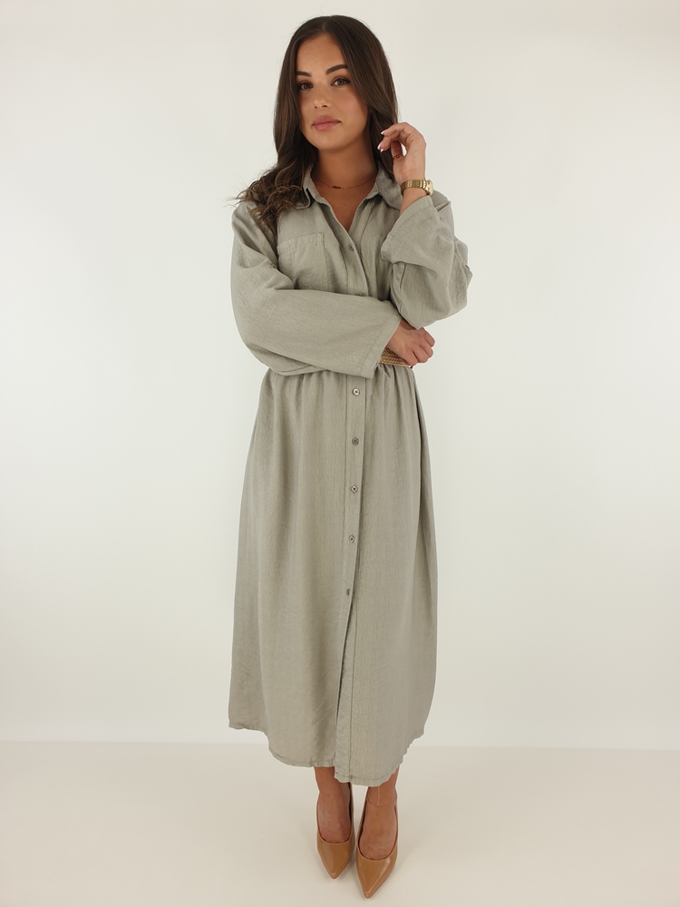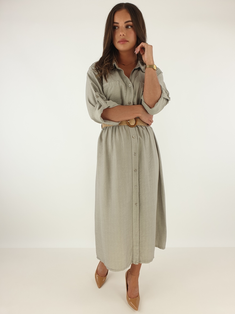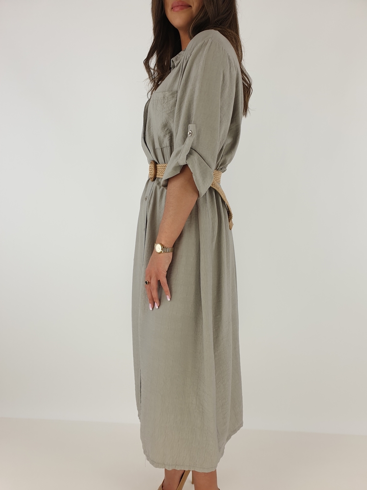 Elastyczny krój oraz przewiewny materiał sprawiają, że noszenie tej sukienki to czysta przyjemność. Zapięcie na guziki pozwala regulować dekolt, a dołączony pasek pięknie podkreśla talię. Rękawy można swobodnie podwinąć, co nadaje całości lekkości. Dodatkowo długość midi świetnie wydłuża sylwetkę i sprawia, że sukienka z kołnierzykiem dobrze wygląda na różnych typach figury.